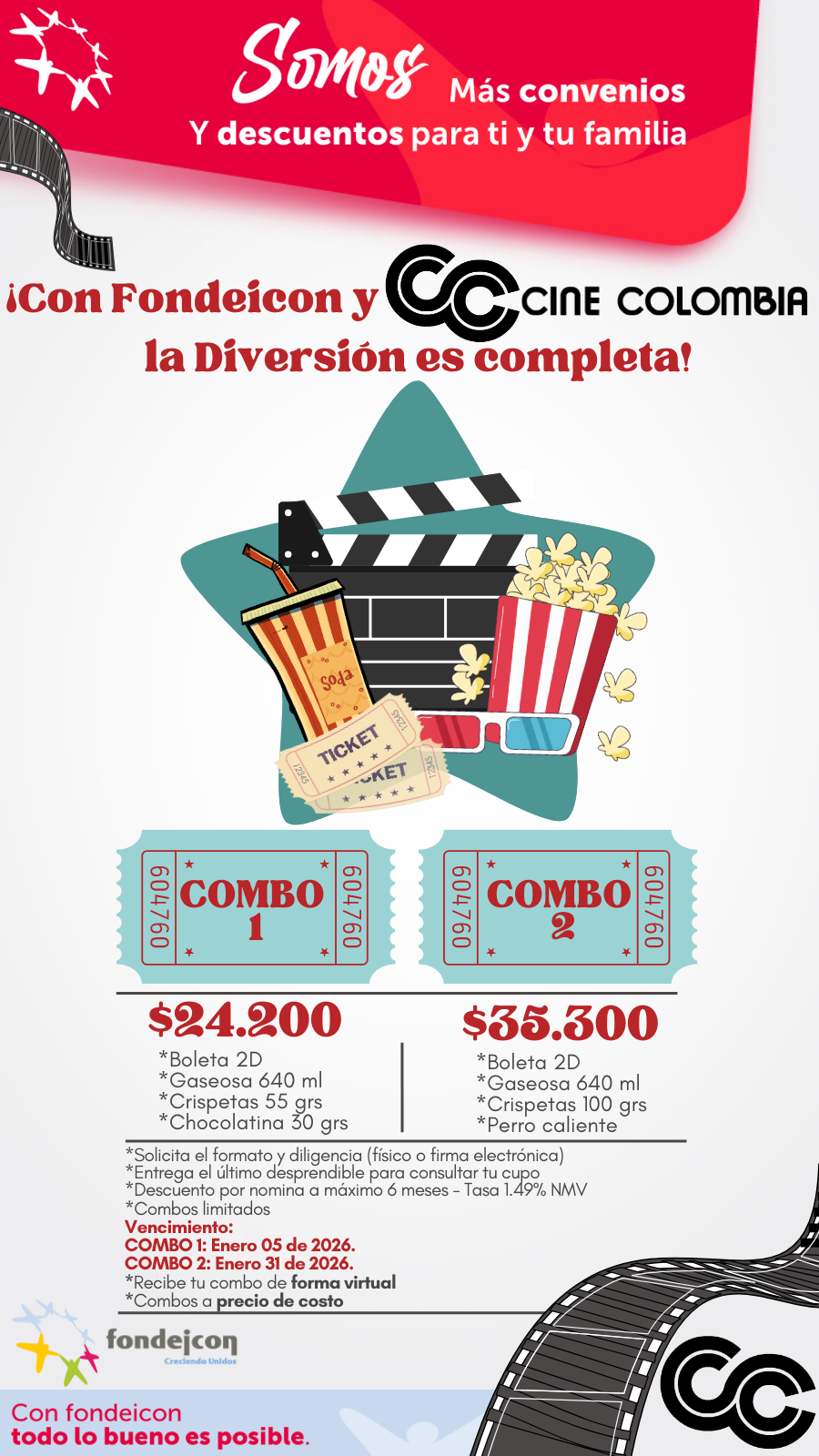 Combo 2: Boleta 2D, Gaseosa 640 ml, Crispeta 100 grs, Perro caliente.
